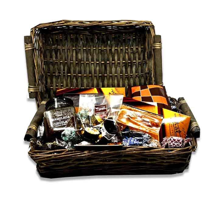 2B.Turrón/ 1T. Choc Rell./ 1B.Mermelada/1B. Rocas de Chocolate. 700 gr. Especialidades vasquitos, nesquitas, goyescos, kirris, goyescas, bocaditos, frutas vascas, trufas de licor, nata y café. INGREDIENTES: Azúcar, Pasta de Cacao, Manteca de Cacao, Avellana, Almendra, Jarabe de Glucosa, Aceites y Grasas Vegetales de origen; coco, girasol, shea, Leche en polvo, Nata, Azúcar Invertido, Frutas Confitadas (piña, naranja, pera, melocotón), Licores, Café, Coco, Emulgente Lecitina de Soja, Conservante Sorbato Potásico, Estabilizante Sorbitol, Conservantes Sulfitos (fruta confitada), Aromas autorizados. // Tarifas de transporte: Álava: 6,15 euros. Provincias Grupo 1: 6,25 euros (limítrofes con Álava), Provincias Grupo 2: 7,15 euros (media distancia), Provincias Grupo 3: 8,15 euros (larga distancia), Baleares: 15,00 euros. // 50% de descuento entre 100 y 200- Gratis por encima de 200 euros./ Presentación final con celofán y lazo de regalo