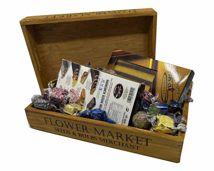 1 Turrón Vasco/ 1 Turrón/ 600 Gr. Surtido de Espec: vasquitos, nesquitas, goyescos, kirris, goyescas, bocaditos, frutas vascas, trufas de licor, nata y café. INGREDIENTES: Azúcar, Pasta de Cacao, Manteca de Cacao, Avellana, Almendra, Jarabe de Glucosa, Aceites y Grasas Vegetales de origen; coco, girasol, shea, Leche en polvo, Nata, Azúcar Invertido, Frutas Confitadas (piña, naranja, pera, melocotón), Licores, Café, Coco, Emulgente Lecitina de Soja, Conservante Sorbato Potásico, Estabilizante Sorbitol, Conservantes Sulfitos (fruta confitada), Aromas autorizados. // Tarifas de transporte: Álava: 6,15 euros. Provincias Grupo 1: 6,25 euros (limítrofes con Álava), Provincias Grupo 2: 7,15 euros (media distancia), Provincias Grupo 3: 8,15 euros (larga distancia), Baleares: 15,00 euros. // 50% de descuento entre 100 y 200- Gratis por encima de 200 euros./ Presentación final con celofán y lazo de regalo