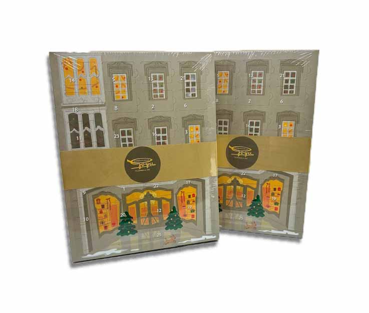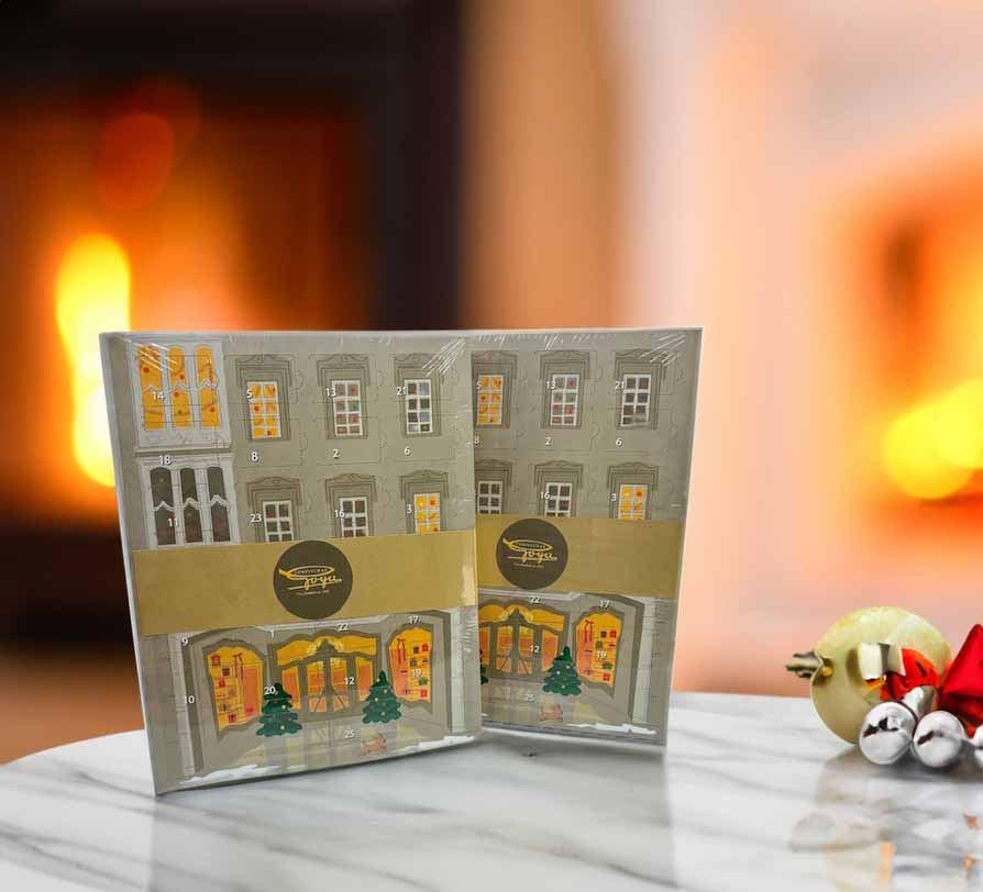 Calendario de Adviento con 25 bombones y trufas, 315 gramos de Surtido de Espec: vasquitos, nesquitas, goyescos, kirris, goyescas, frutas vascas, trufas de nata y café. INGREDIENTES: Azúcar, Pasta de Cacao, Manteca de Cacao, Avellana, Almendra, Jarabe de Glucosa, Aceites y Grasas Vegetales de origen; coco, girasol, shea, Leche en polvo, Nata, Azúcar Invertido, Frutas Confitadas (piña, naranja, pera, melocotón), Café, Coco, Emulgente Lecitina de Soja, Conservante Sorbato Potásico, Estabilizante Sorbitol, Conservantes Sulfitos (fruta confitada), Aromas autorizados. // Tarifas de transporte: Álava: 6,15 euros. Provincias Grupo 1: 6,25 euros (limítrofes con Álava), Provincias Grupo 2: 7,15 euros (media distancia), Provincias Grupo 3: 8,15 euros (larga distancia), Baleares: 15,00 euros. // 50% de descuento entre 100 y 200- Gratis por encima de 200 euros./ Presentación final con celofán y lazo de regalo