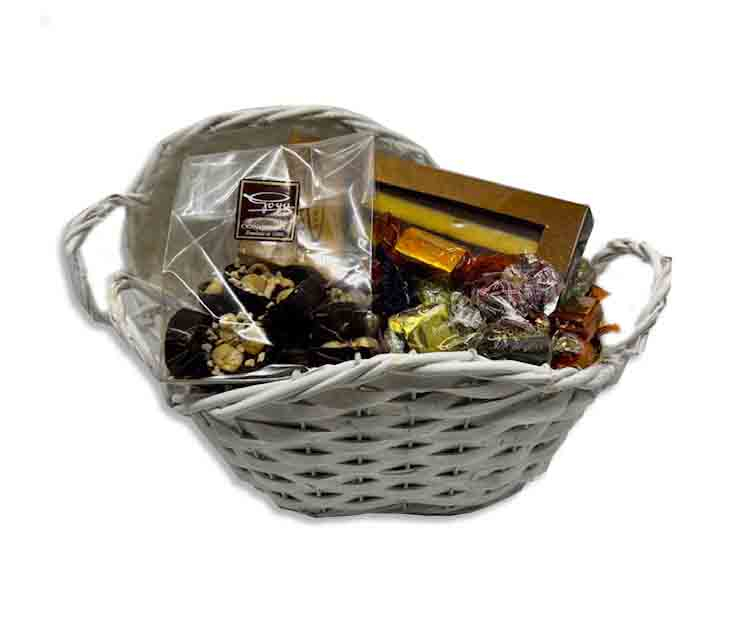 1B.Rocas choc/ 1Turron/ 500 gr. Surtido de Espec. vasquitos, nesquitas, goyescos, kirris, goyescas, bocaditos, frutas vascas, trufas de licor, nata y café. INGREDIENTES: Azúcar, Pasta de Cacao, Manteca de Cacao, Avellana, Almendra, Jarabe de Glucosa, Aceites y Grasas Vegetales de origen; coco, girasol, shea, Leche en polvo, Nata, Azúcar Invertido, Frutas Confitadas (piña, naranja, pera, melocotón), Licores, Café, Coco, Emulgente Lecitina de Soja, Conservante Sorbato Potásico, Estabilizante Sorbitol, Conservantes Sulfitos (fruta confitada), Aromas autorizados. // Tarifas de transporte: Álava: 6,15 euros. Provincias Grupo 1: 6,25 euros (limítrofes con Álava), Provincias Grupo 2: 7,15 euros (media distancia), Provincias Grupo 3: 8,15 euros (larga distancia), Baleares: 15,00 euros. // 50% de descuento entre 100 y 200- Gratis por encima de 200 euros./ Presentación final con celofán y lazo de regalo