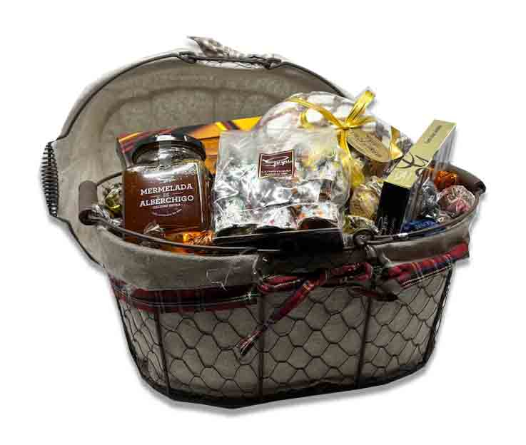 2B.Turrón/1B.Mermelada/ 1B.Poncheras/1Talo de Urbía Pq./ 700 Gr. Surtido de Espec. vasquitos, nesquitas, goyescos, kirris, goyescas, bocaditos, frutas vascas, trufas de licor, nata y café. INGREDIENTES: Azúcar, Pasta de Cacao, Manteca de Cacao, Avellana, Almendra, Jarabe de Glucosa, Aceites y Grasas Vegetales de origen; coco, girasol, shea, Leche en polvo, Nata, Azúcar Invertido, Frutas Confitadas (piña, naranja, pera, melocotón), Licores, Café, Coco, Emulgente Lecitina de Soja, Conservante Sorbato Potásico, Estabilizante Sorbitol, Conservantes Sulfitos (fruta confitada), Aromas autorizados. // Tarifas de transporte: Álava: 6,15 euros. Provincias Grupo 1: 6,25 euros (limítrofes con Álava), Provincias Grupo 2: 7,15 euros (media distancia), Provincias Grupo 3: 8,15 euros (larga distancia), Baleares: 15,00 euros. // 50% de descuento entre 100 y 200- Gratis por encima de 200 euros./ Presentación final con celofán y lazo de regalo