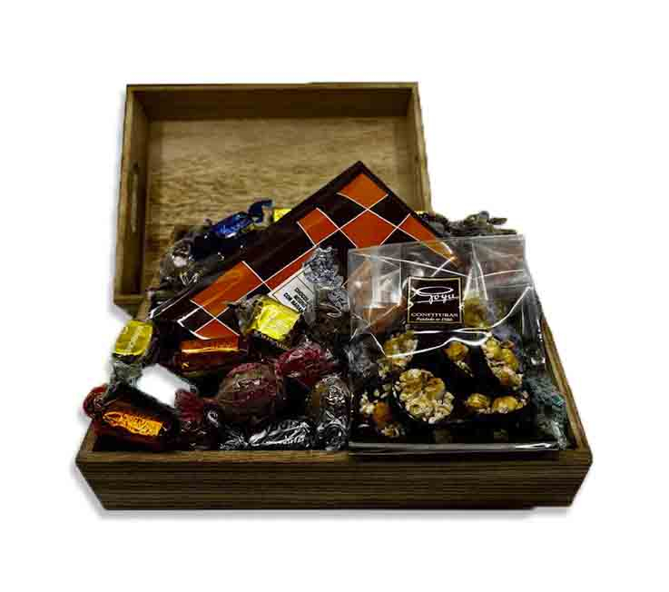 1B.Choc. Naranja/Rocas de chocolate y frutos secos/ 500 gr. Surtido de Bombones y Trufas: vasquitos, nesquitas, goyescos, kirris, goyescas, bocaditos, frutas vascas, trufas de licor, nata y café. INGREDIENTES: Azúcar, Pasta de Cacao, Manteca de Cacao, Avellana, Almendra, Jarabe de Glucosa, Aceites y Grasas Vegetales de origen; coco, girasol, shea, Leche en polvo, Nata, Azúcar Invertido, Frutas Confitadas (piña, naranja, pera, melocotón), Licores, Café, Coco, Emulgente Lecitina de Soja, Conservante Sorbato Potásico, Estabilizante Sorbitol, Conservantes Sulfitos (fruta confitada), Aromas autorizados. // Tarifas de transporte: Álava: 6,15 euros. Provincias Grupo 1: 6,25 euros (limítrofes con Álava), Provincias Grupo 2: 7,15 euros (media distancia), Provincias Grupo 3: 8,15 euros (larga distancia), Baleares: 15,00 euros. // 50% de descuento entre 100 y 200- Gratis por encima de 200 euros./ Presentación final con celofán y lazo de regalo