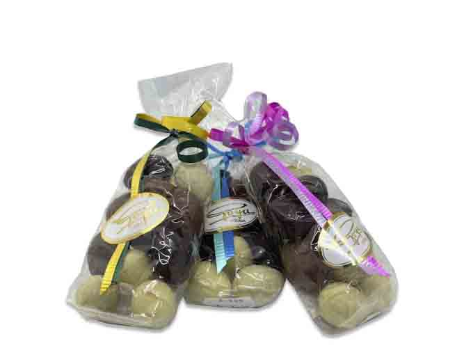 Huevitos de Pascual rellenos de praliné de frutos secos con tres coberturas distintas: negra, lecha y blanca.
