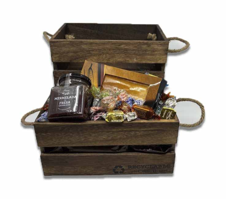 1Turron / 1 B. Mermelada./ 500 gr. Surtido de Espec: vasquitos, nesquitas, goyescos, kirris, goyescas, frutas vascas, trufas de nata y café. INGREDIENTES: Azúcar, Pasta de Cacao, Manteca de Cacao, Avellana, Almendra, Jarabe de Glucosa, Aceites y Grasas Vegetales de origen; coco, girasol, shea, Leche en polvo, Nata, Azúcar Invertido, Frutas Confitadas (piña, naranja, pera, melocotón), Café, Coco, Emulgente Lecitina de Soja, Conservante Sorbato Potásico, Estabilizante Sorbitol, Conservantes Sulfitos (fruta confitada), Aromas autorizados. // Tarifas de transporte: Álava: 6,15 euros. Provincias Grupo 1: 6,25 euros (limítrofes con Álava), Provincias Grupo 2: 7,15 euros (media distancia), Provincias Grupo 3: 8,15 euros (larga distancia), Baleares: 15,00 euros. // 50% de descuento entre 100 y 200- Gratis por encima de 200 euros./ Presentación final con celofán y lazo de regalo